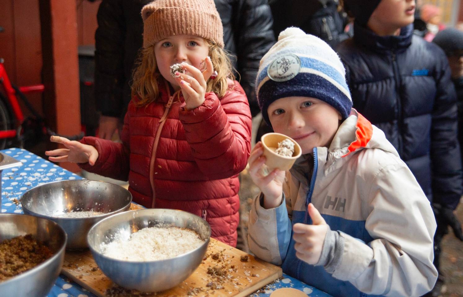 Smaken av julJulen har allerede satt smak hos oss! Vi har rukket to skikkelig hyggelige og velduftende juleverksteder. Og vi har mer på blokka! På torsdag er Geitmyra juniorkokker med på den årlige julegrantenningen på Vulkan. Vi serverer gløgg og pepperkaker og barna kan lage meiseboller til små, fjærkledde venner. På søndag i Tønsberg inviterer vi barn, ungdom og familier på en reise gjennom fire epoker – steinalderen, jernalderen, middelalderen og 1800-tallet. Gjennom smak, lukt, lys og fortellinger levendegjør vi høytiden og dens røtter: fra solvervsbål og offermåltider til julegrøt, ølbrygging og pyntede grantrær. Hver onsdag frem til jul er vi også på plass i demenslandsbyen Dronning Ingrids hage med Tidløs matglede. Der inviterer vi beboere, familie og nabolag til hyggelige generasjonstreff. Vi skal lage tradisjonsmat, spiselige gaver, se på julens krydder og smake på jula. Kom i julestemning sammen med oss! – Vilkveite er nesten bedre enn pizza!Nærmere 700 små og store tok turen til Barnas spiselige gaveverksted på Geitmyra denne søndagen. I pizzaovnen ventet ikke pizza – men en hel villkveite. Geitmyra gård var pyntet til mønet, og selv om været var grått, var det julestemningen på tunet. Her kunne barna lage sine egne spiselige julegaver. Daddelkuler, sylta grønnsaker, gløggkrydder, sennep og meiseboller blir å finne under mange juletrær i år.
